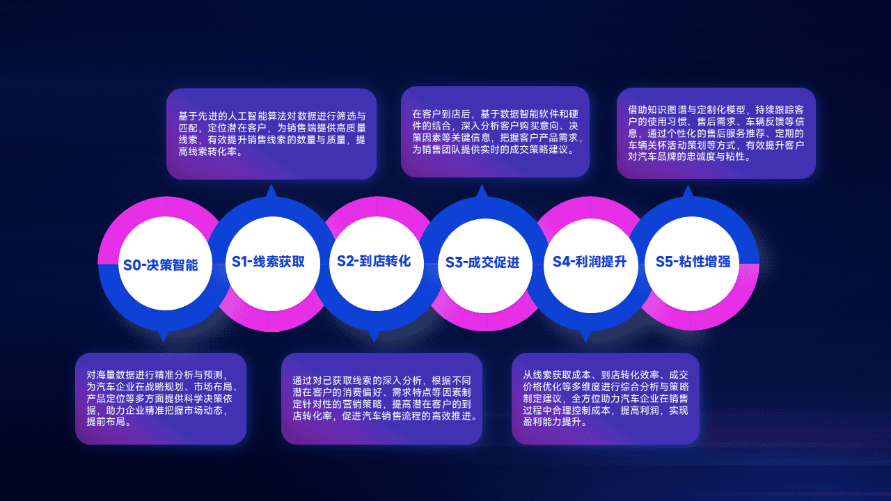 基于销售转化漏斗的薄弱环节,,,,为客户提供数据+模型+运营的智能应用,,实现销售业绩的提升;推动线索管理全链路的精细化管理和运营。。